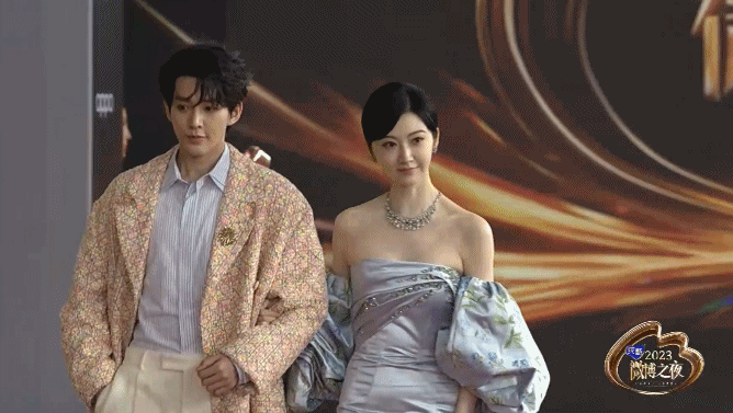 她换上了一件长长的拖地礼服,和新晋的超级明星邓为一起,优雅地走上了红毯。