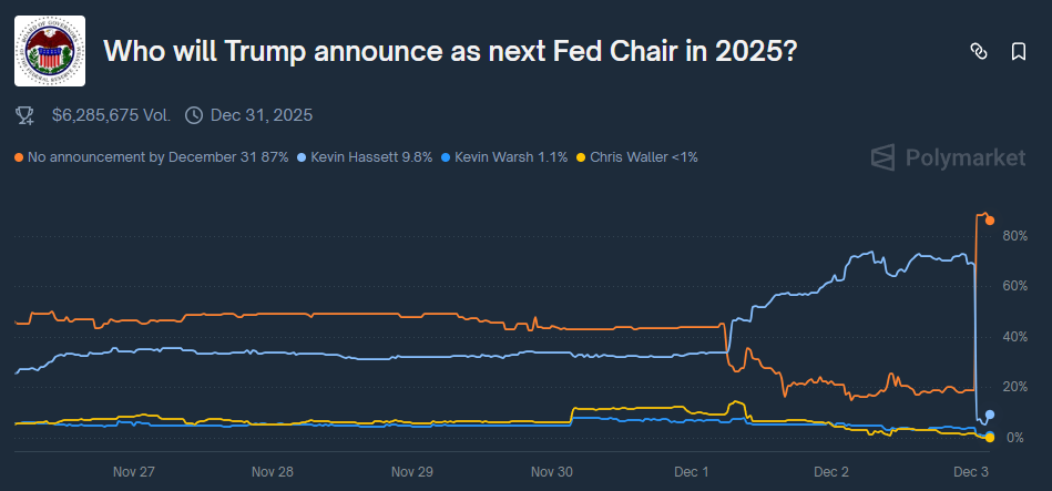 受这一消息影响,在预测平台Polymarket上,“12月底前不会宣布美联储主席人选”这一选项的概率从31%左右跳涨至87%附近。